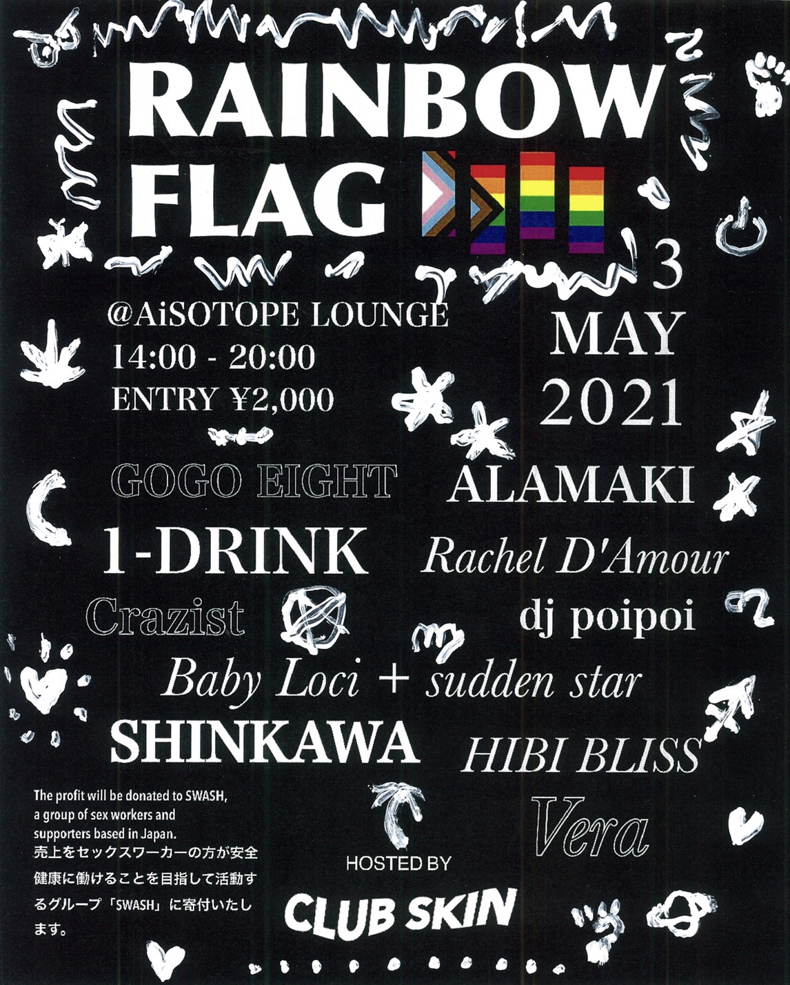 CLUB SKINの売上をセックスワーカーの方が安全、健康に働けることを目指して活動するグループ「SWASH」に寄付いたします。