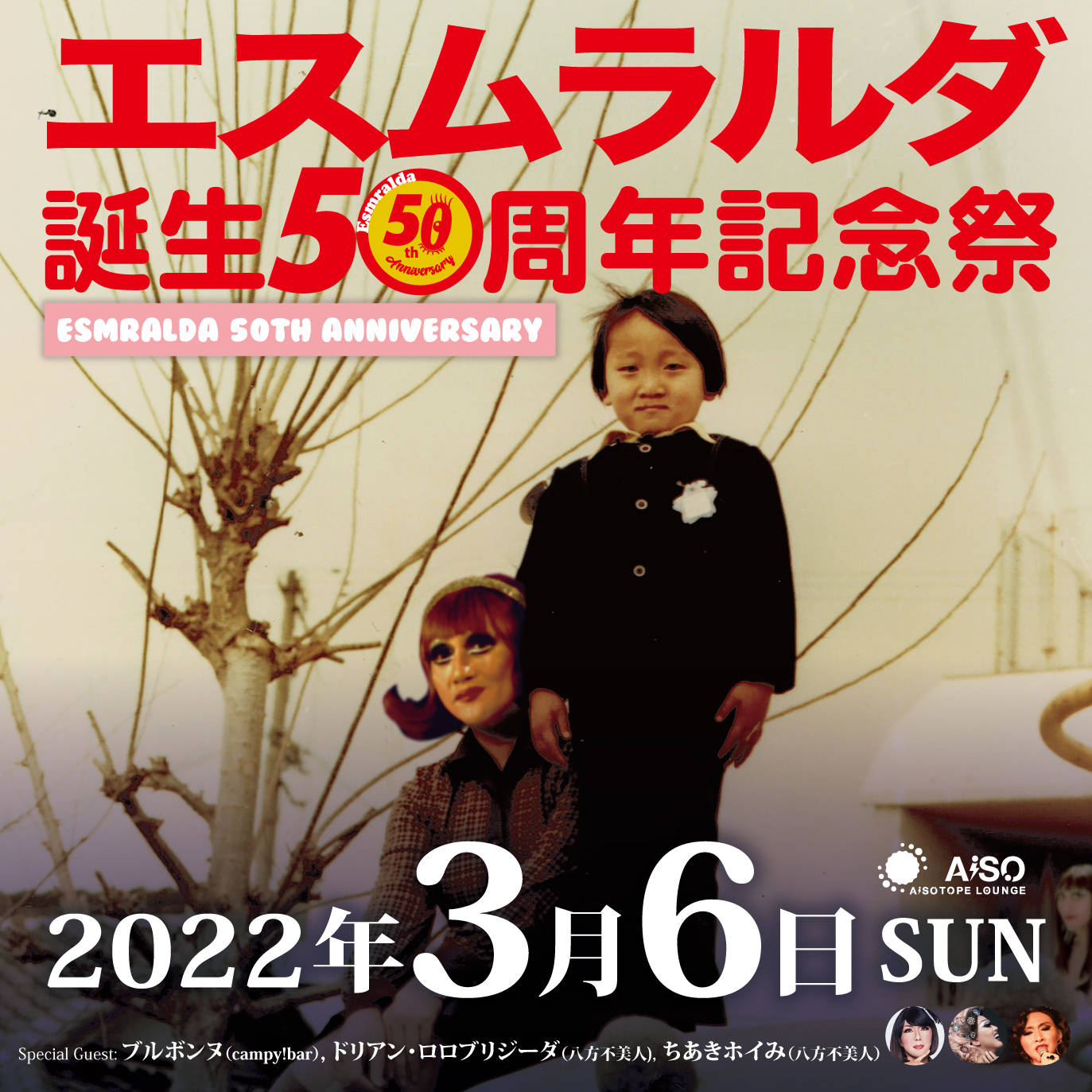 エスムラルダが、30年来の友人であるブルボンヌ、 「八方不美人」メンバーのドリアン・ロロブリジーダ、ちあきホイみと共に、 トークあり懐かしのショーあり歌ありでお送りする、誕生50周年記念祭!