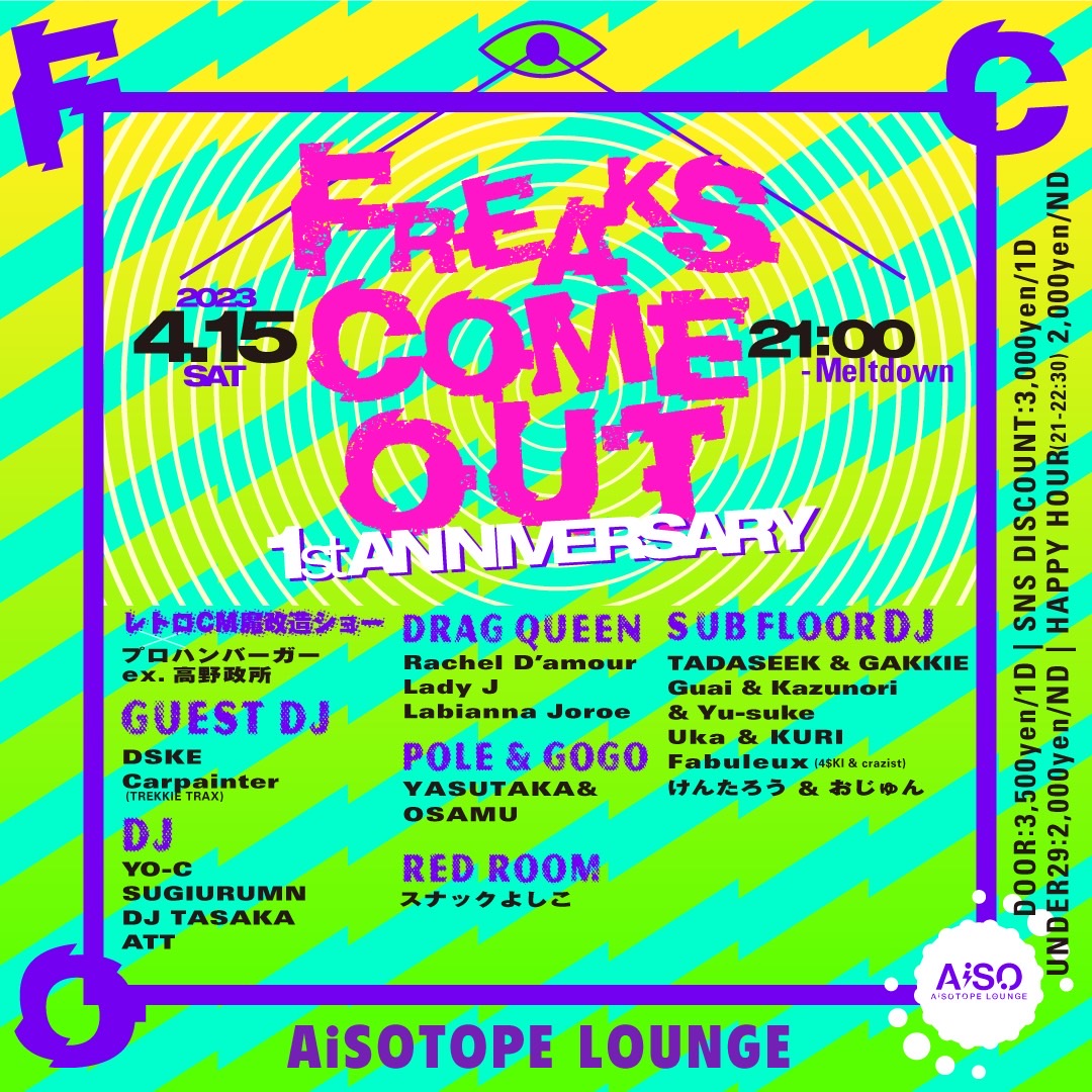 セクシュアリティや国籍、年代もバックグラウンドも一切問われないダンスフロアを出現させて来たこのパーティ。YO-C、SUGIURUMN、DJ TASAKA、ATTが旗手となり新宿二丁目を舞台に華々しくスタートした「FREAKS COME OUT」が早くも1周年を迎える。
