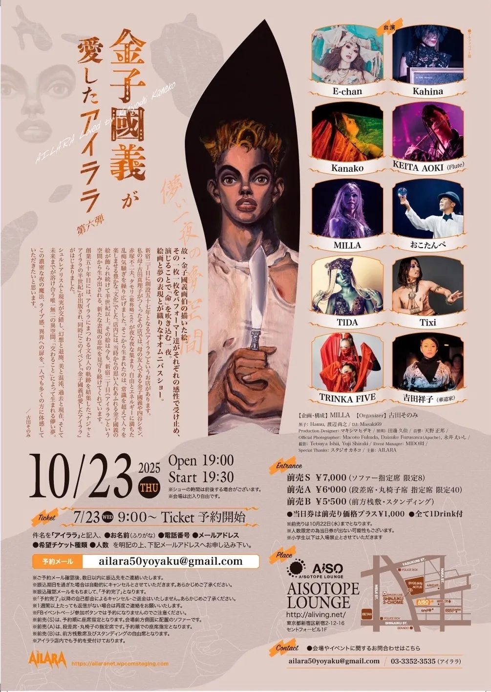 店内には、当時からの思い入れあふれる金子國義の絵が飾られ続けて半世紀以上。その絵は今も、新宿2丁目《アイララ》という空間から生み出される、新たな表現の息吹を見守り続けてくれています。