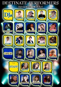 DJ: AKIPOYO, KIMUNII, KOJI, LEO, MADIGAN, MIZUK!, M★NARUSE, M・LINA, MUGI, DJ SAWA, SHO, TAKITO, YUIYUI, YUU