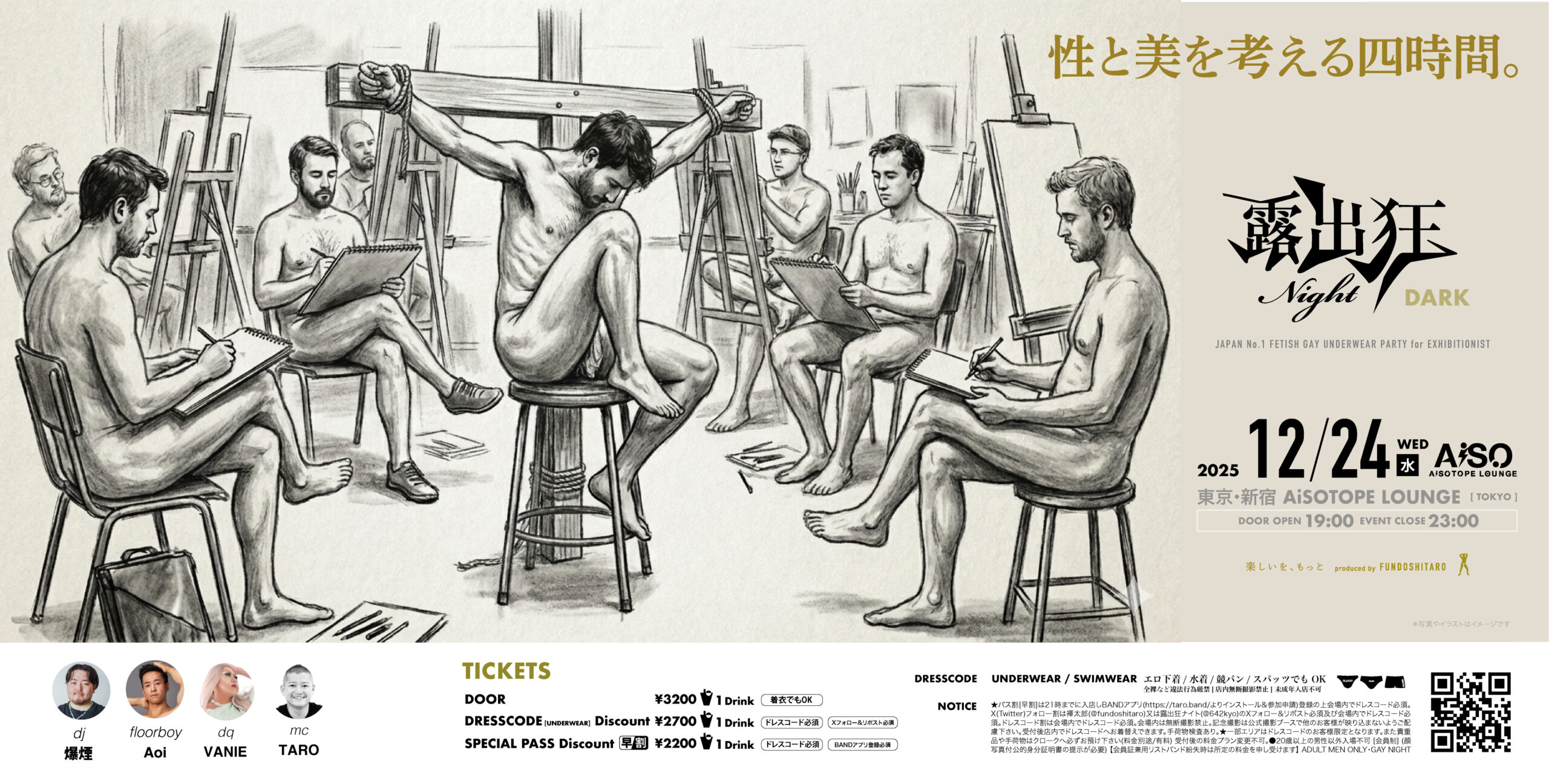★パス割[早割]は21時までに入店しBANDアプリ(https://taro.band/よりインストール&参加申請)登録の上会場内でドレスコード必須。X(Twitter)フォロー割は褌太郎(@fundoshitaro)又は露出狂ナイト(@642kyo)のXフォロー&リポスト必須及び会場内でドレスコード必須。ドレスコード割は会場内でドレスコード必須。会場内は無断撮影禁止。記念撮影は公式撮影ブースで他のお客様が映り込まないようご配慮下さい。受付後店内でドレスコードへお着替えできます。手荷物検査あり。