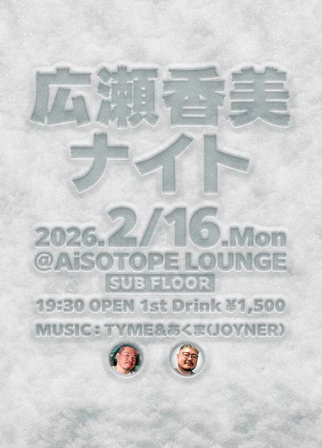 ■ INFORMATION – LOUNGE FLOOR – [OPEN] 19:30 – 23:30 [FEE] 1st drink ¥1,500(以降のご注文は通常料金) [GENRE] 広瀬香美 [CA […] ...