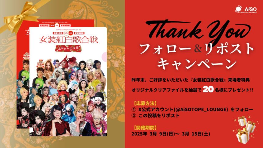 日頃の感謝の気持ちとXフォロワー2万人突破を記念して、昨年ご好評をいただきました『女装紅白歌合戦』来場者特典オリジナルクリアファイルを抽選で20名様にプレゼント致します。