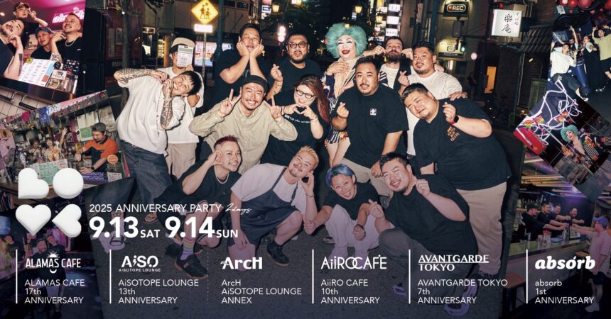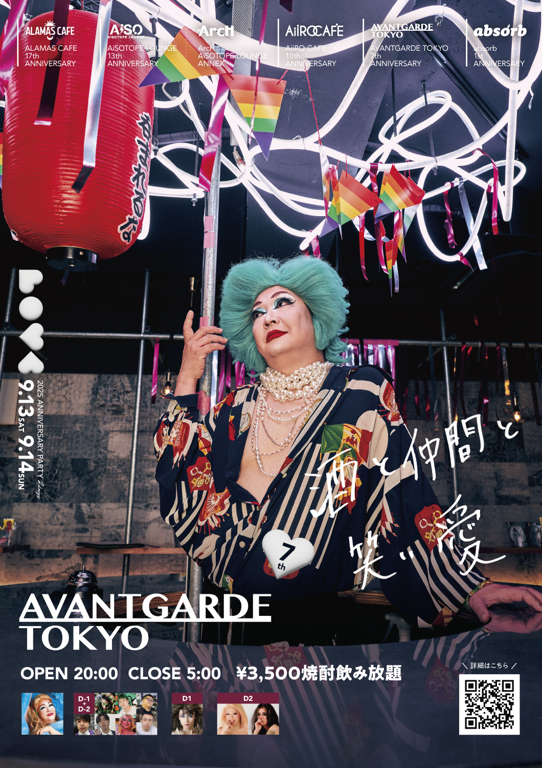 またこの2日間は、系列店舗のALAMAS CAFE、AiiRO CAFE、AVANTGARDE TOKYO、absorbのアニバーサリーイベントも合同開催される。ディープな二丁目の夜を回遊して楽しもう!!