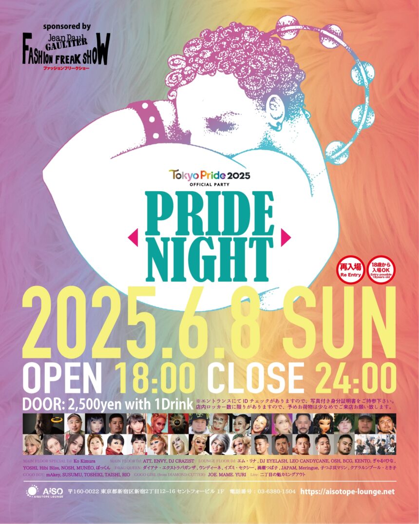 2025年6月8日(日)、代々木公園イベント広場にて開催されるTokyo Prideの『Pride Festival』『Pride Parade』で盛り上がった後は、その余韻に浸りつつ、公式アフターパーティ『Pride Night』が新宿二丁目・AiSOTOPE LOUNGEで開催決定!